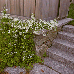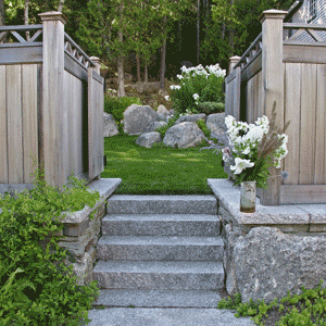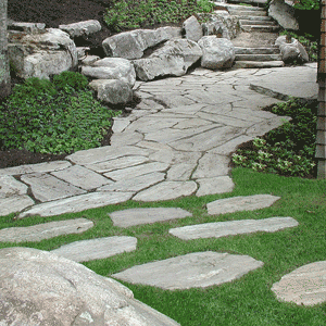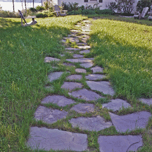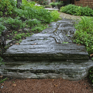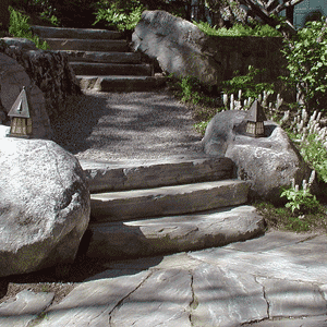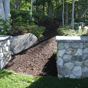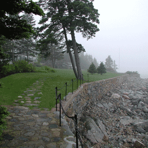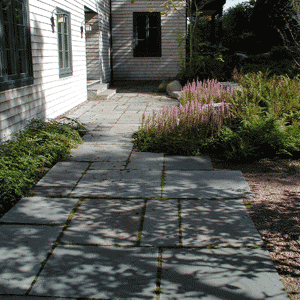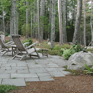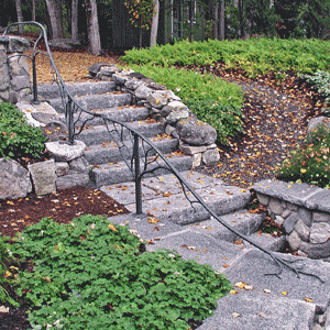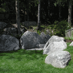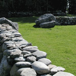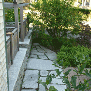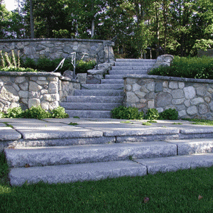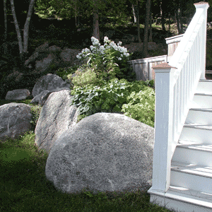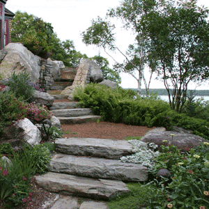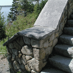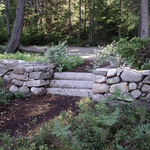 Stone has been called the bones of the earth, and from it we shape the skeleton of the landscape. Rough, lichen-covered boulders hold up a hillside thick with blueberry bushes, cut granite blocks form a wall. Stone provides more than structure, it gives color and texture, a warm spot to doze in the sun, a cool path underfoot. Isamu Noguchi wrote that stone could be: