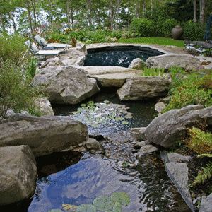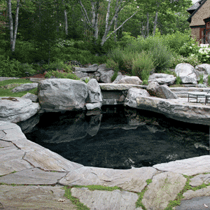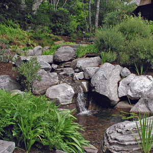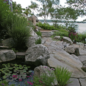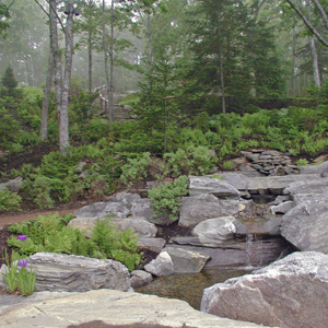From the soothing trickle of a small stream to the ravages of the Atlantic’s pounding waves, the control and direction of water is frequently at the core of our projects. Water can be an ally in the garden, appealing to all five senses as it irrigates parched plants, cools bare feet, burbles around stones, and forms small pools that twinkle with reflected light. It can also be a destructive force, undercutting slopes and thundering against the shoreline. The movement of water over stone is the essence of the Maine landscape.