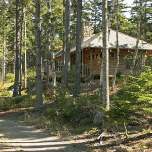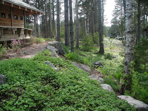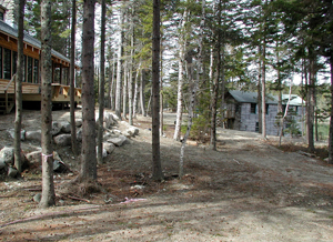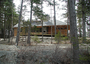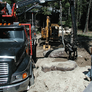 These massive boulders were gathered in local blueberry barrens, using an excavator and a pulp truck. The pulp truck, shown here, is ordinarily used to transport tree trunks for the lumber industry. The claw mounted on the truck is invaluable for setting the boulders into position.